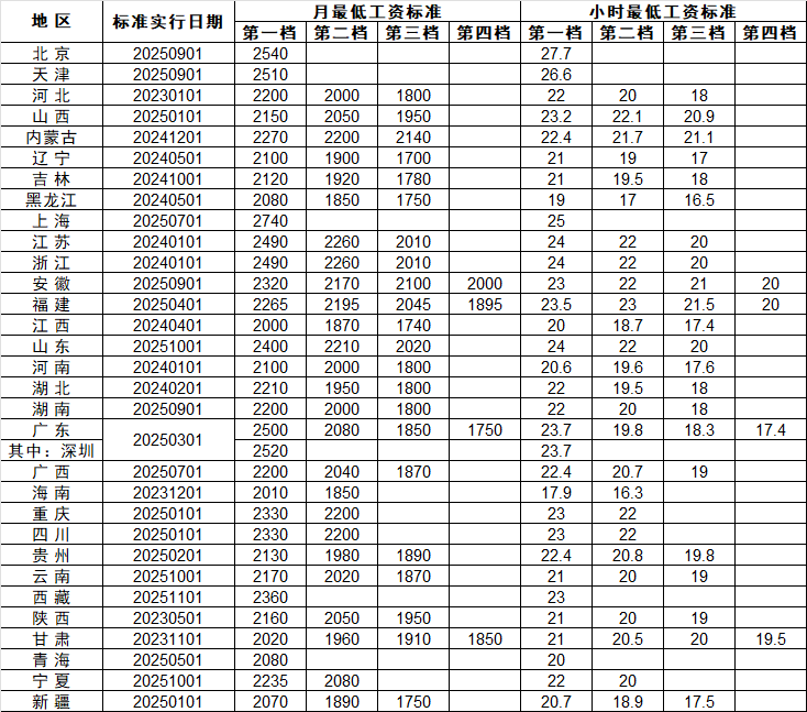 2025年最低工资标准统计表
