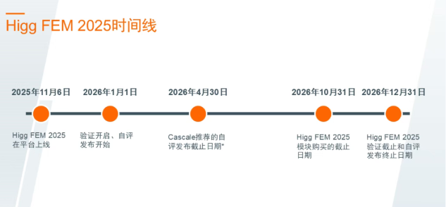 Higg FEM 2025模块已于2025年11月6日在平台上开放购买,工厂全年发布Higg FEM自评都将会有机会在初次发布的60天内取消和重新发布(发布不应晚于Higg FEM 2025的截止日期2026年12月31日) 4月30日依然作为官方推荐的行业对标截止时间。