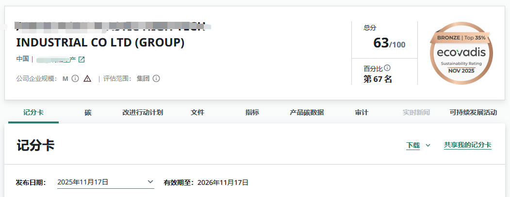 致佳咨询近期辅导某知名集团客户获得ecovadis评估铜牌荣誉,公司技术创新上屡有突破,引领行业技术升级潮流,更在绿色发展方面展现出积极探索的精神,践行可持续发展理念。通过坚持绿色、循环、低碳发展路径获评省级绿色工厂,减少环境污染,提升市场竞争力。